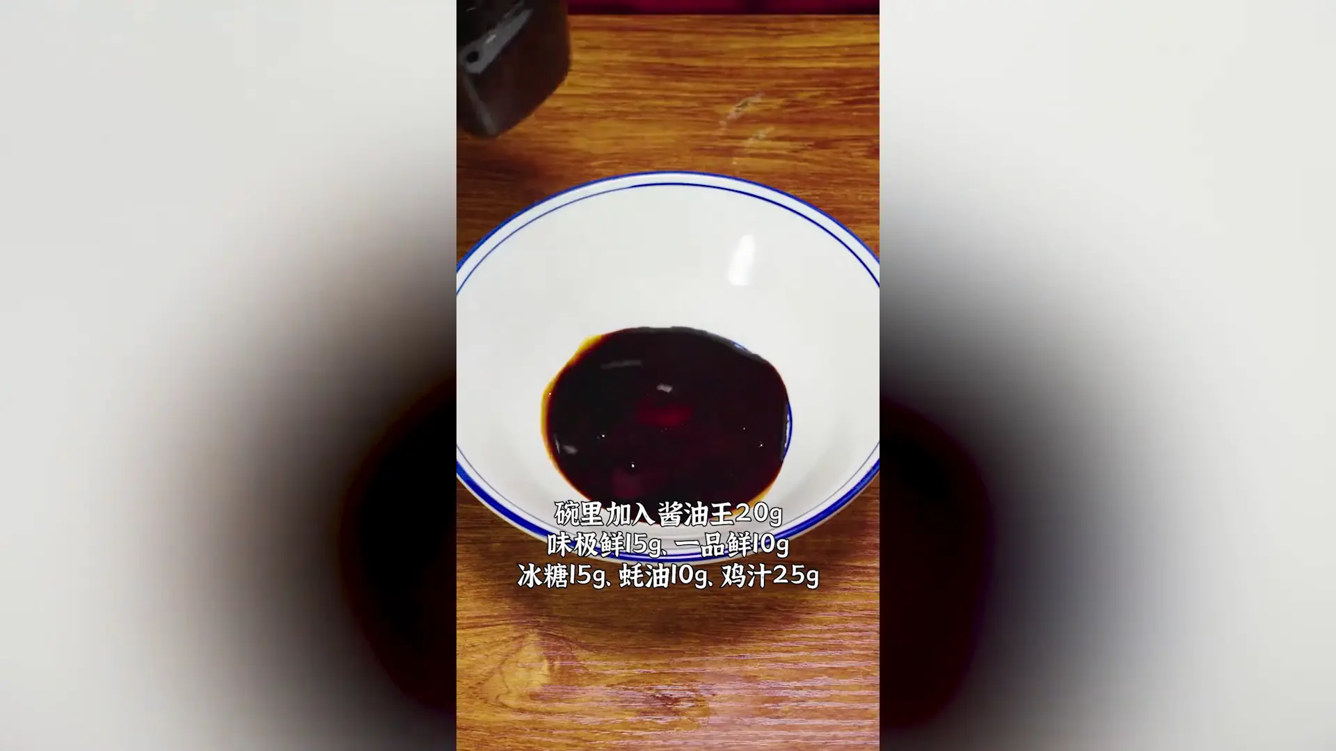 ·现在把它过滤出来,碗里加入酱油王20g、味极鲜15g、一品鲜10g、冰糖15g、蚝油10g、鸡汁25g,给它鼓一鼓。最后加入腿鱼露30g,再一次给它鼓一鼓。