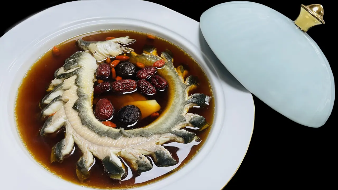 这道菜的主要食材非常简单,只用到了富春江江鳗和十五年陈花雕酒。将宰杀好的江鳗改成盘龙花刀焯水清洗干净,加入花雕酒、姜片、葱、少许盐,腌制10分钟。然后在煲内加入花雕酒、红枣、姜片、干香菇、矿泉水少许、冰糖、盐,将腌制好江鳗放入,小火慢炖40分钟即可。