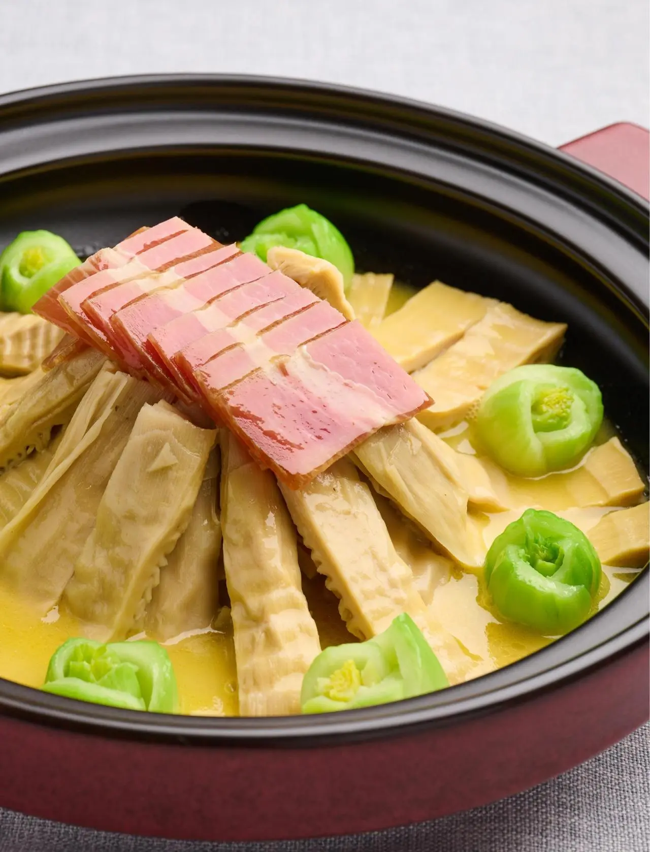 菜里用的笋筒尖可不一般。它来自深山竹林,得天独厚的地理环境让竹笋自然生长。笋农细心地将野笋从高山挖来以后,通过清洗、精剪、自然晾晒、筛选等多道工序,保证笋筒尖的口感。笋不经过烟熏就不会含硫,而且保持原色,每一支都纹路清晰,片宽节短,还有淡淡的竹香。